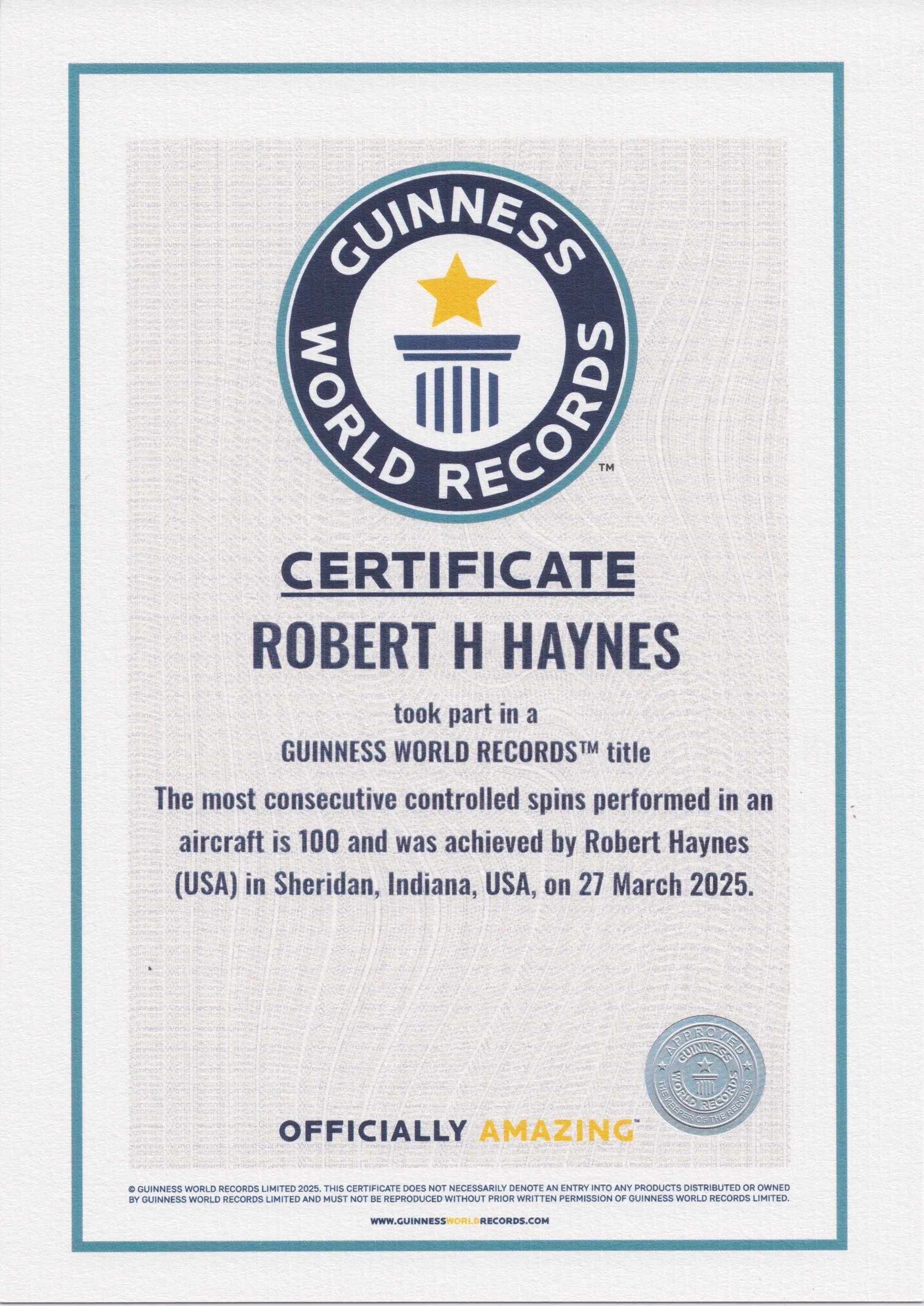On 3/27/25 at 5I4 (Sheridan, IN), Robert Haynes and N614AC made history by setting the world record of 100 individual spins in ONE FLIGHT!